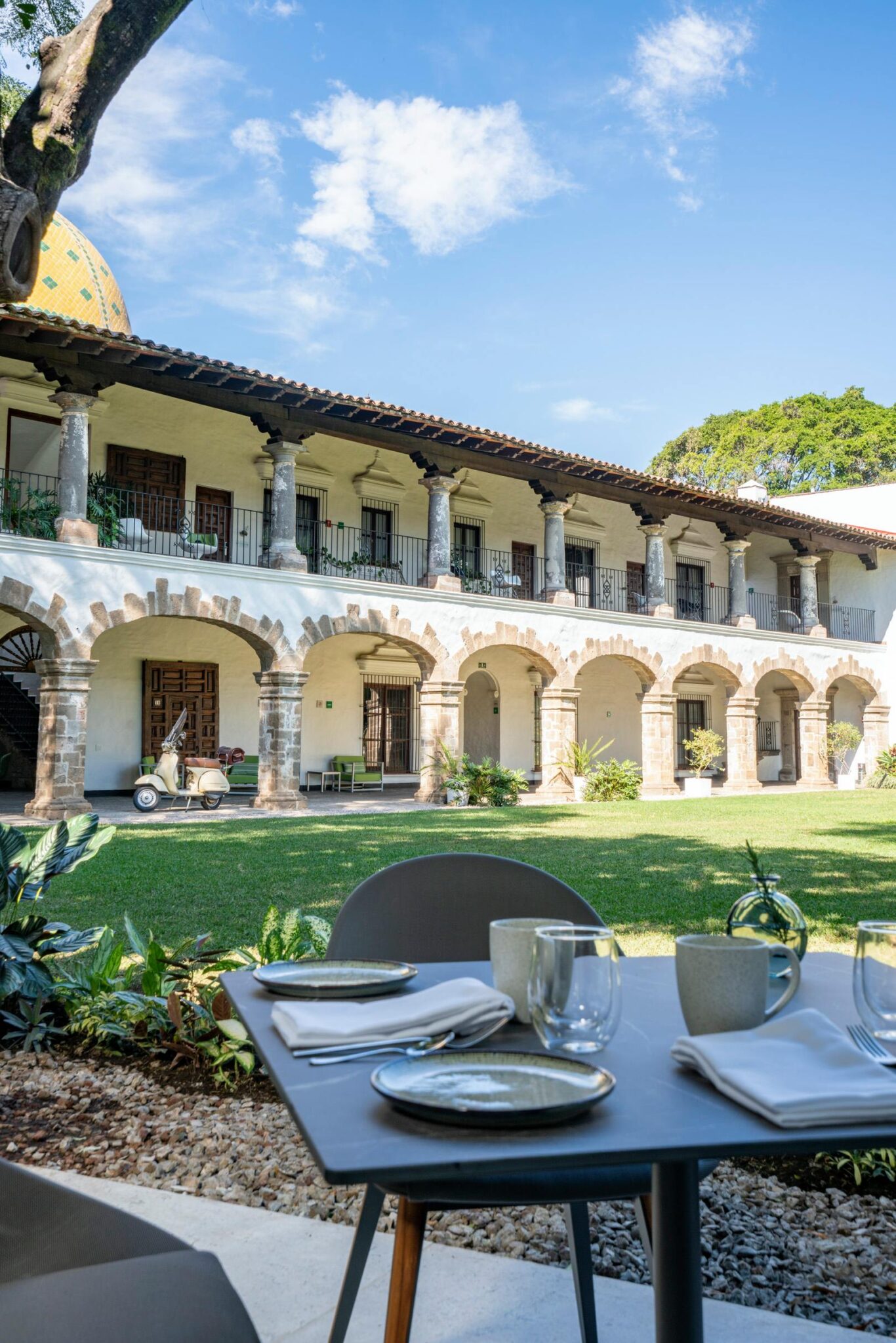 Esta hacienda de estilo colonial data del siglo XVII, pero tiene un toque italiano moderno que recibe a sus huéspedes con un paisaje seductor: grandes jardines con plantas endémicas, un patio central rodeado por arcos, pasillos llenos de arte y detalles que reconocen su historia, como canteras, vigas, pisos y columnas originales que se integraron de manera orgánica al twist contemporáneo que le dio Bernardo Gómez Pimienta.