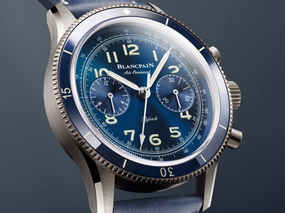 El diseño azulado por el que ha optado Blancpain le otorga un carácter profundo y dinámico al reloj. Su esfera sublimada por un acabado soleado con cronógrafos azules y marcadores blancos, está debidamente protegida con un zafiro tipo glass box.