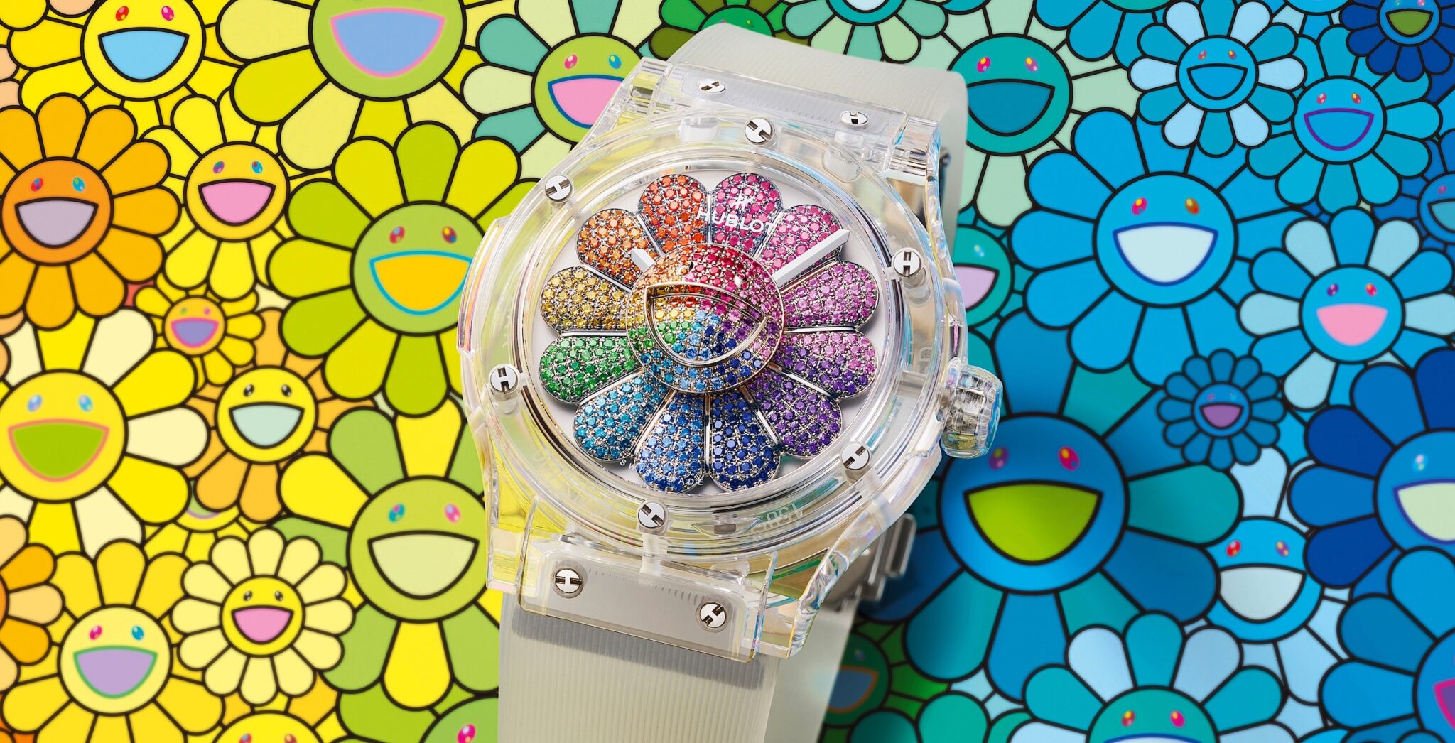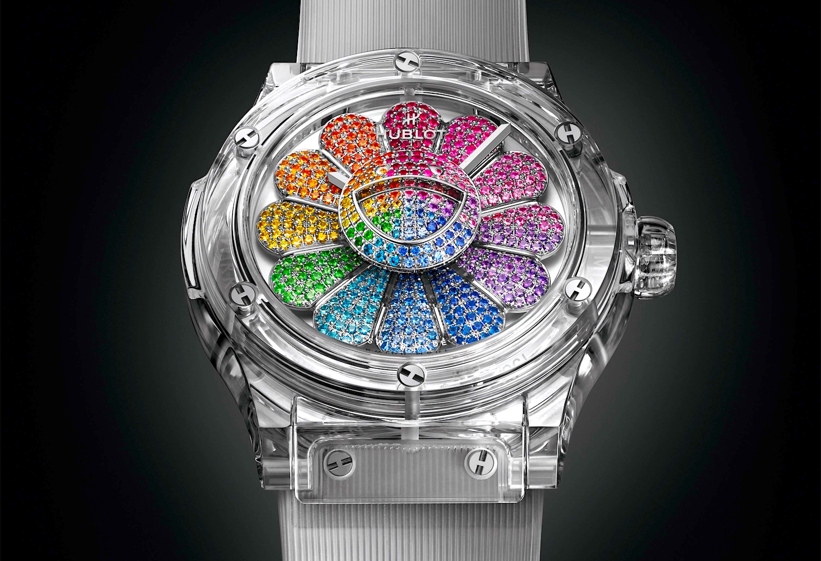 Este colorido reloj cuenta con tecnología exclusiva de Hublot, en este caso acompañada por la flor sonriente de Murakami que se conoce a nivel mundial. Los doce pétalos de esta llamativa flor están adornados con 487 piedras preciosas: zafiros rosa, amarillo y naranja, además de rubíes y amatistas.