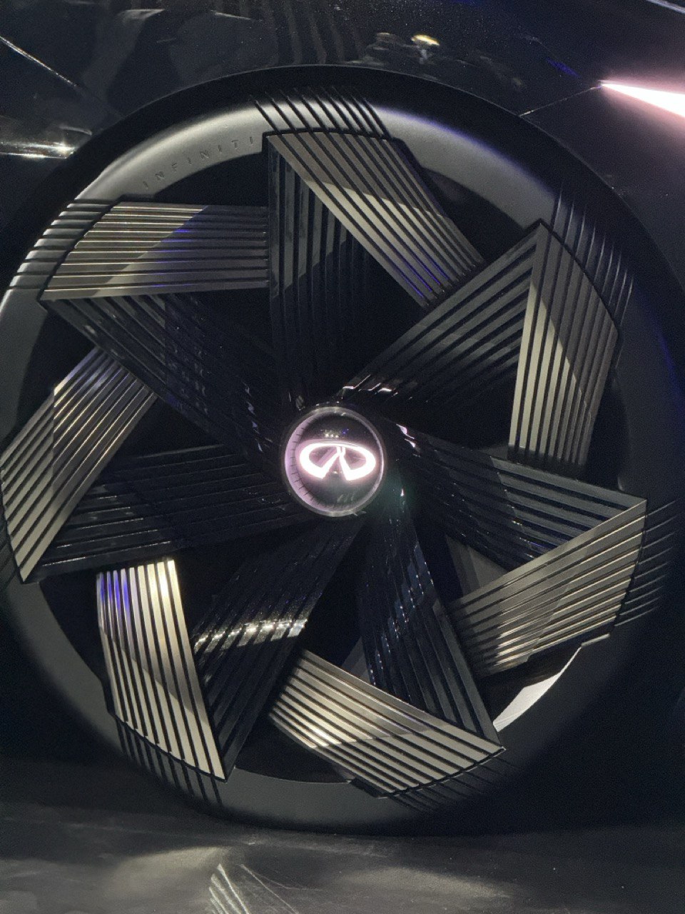 Con acabados en pintura «Shadow Blue», detalles en color dorado y una parrilla iluminada por LED, el Vision Qe exhibe la evolución de la marca. El nuevo emblema tridimensional de INFINITI destaca en la parte delantera, subrayando la renovación constante de la marca.