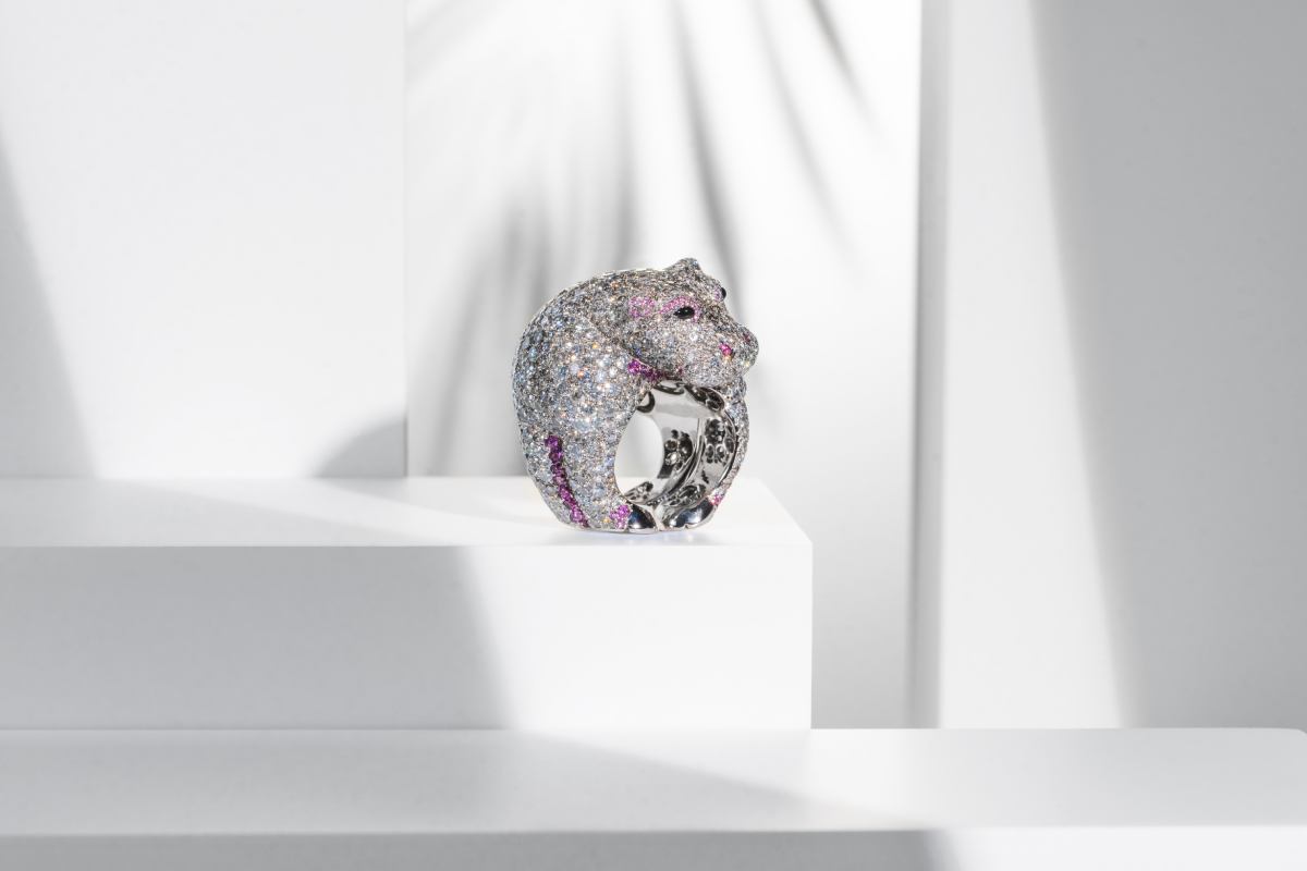Amante declarada de los animales, Caroline encuentra en sus mascotas una fuente constante de ternura e inspiración. Byron, su Cavalier King Charles, se convierte en protagonista de una sortija tallada con diamantes blancos, negros y coñac, tan realista como enternecedora. También aparece una figura inesperada pero encantadora: un hipopótamo cuyas curvas suaves y piel de diamantes grises engastados con granates dan vida a una de las piezas más lúdicas de la colección. Esta serie bestiaria no solo refleja su amor por la fauna, sino también su capacidad de imprimir emoción y humor en cada creación.